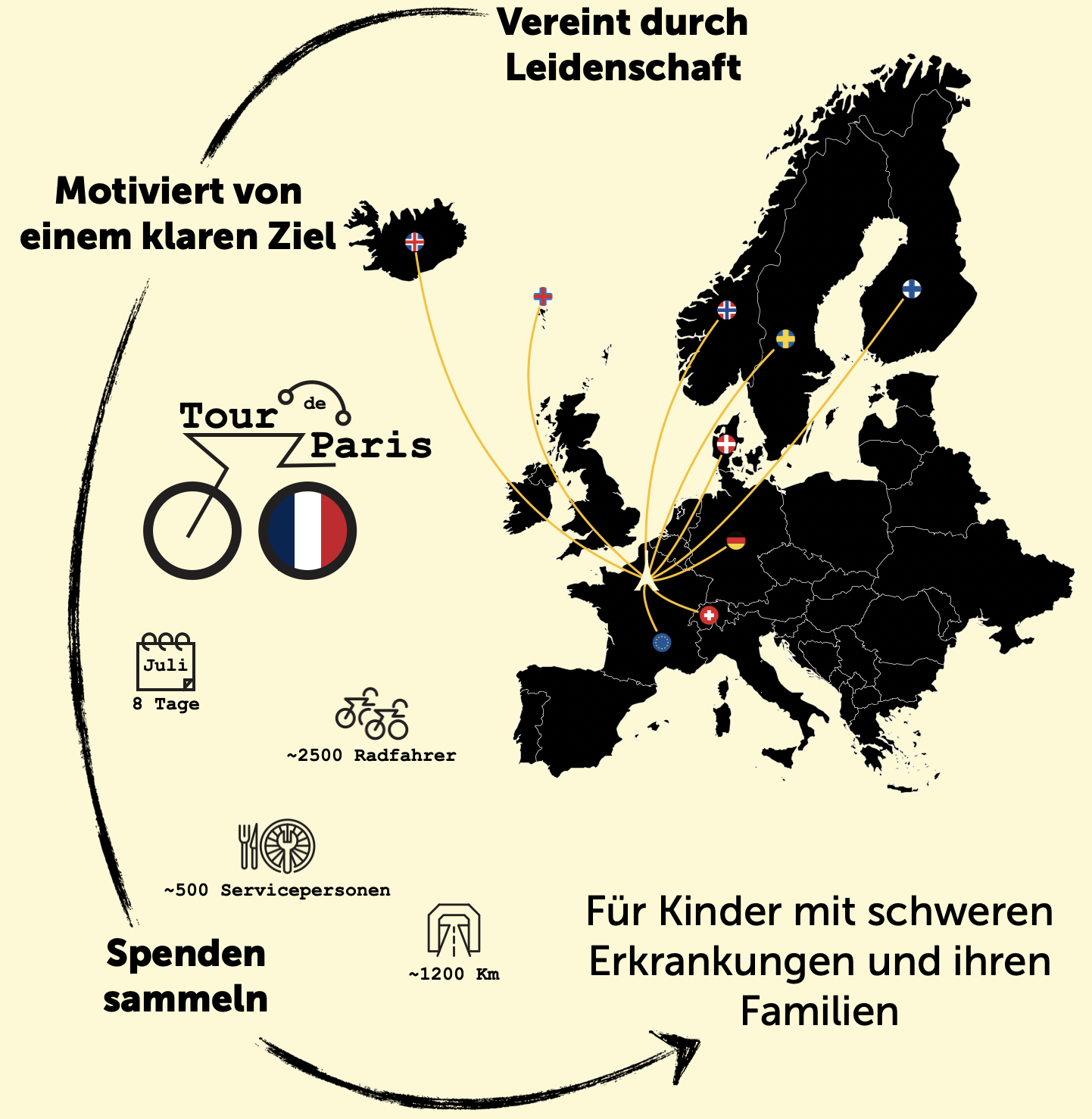 Jedes Jahr fahren hunderte engagierte Menschen aus ganz Europa mit dem Rad nach Paris, um Spenden für schwerkranke Kinder zu sammeln. Die Fahrt ist sportliche Herausforderung, Teamreise und Herzensprojekt in einem – und du kannst dabei sein.