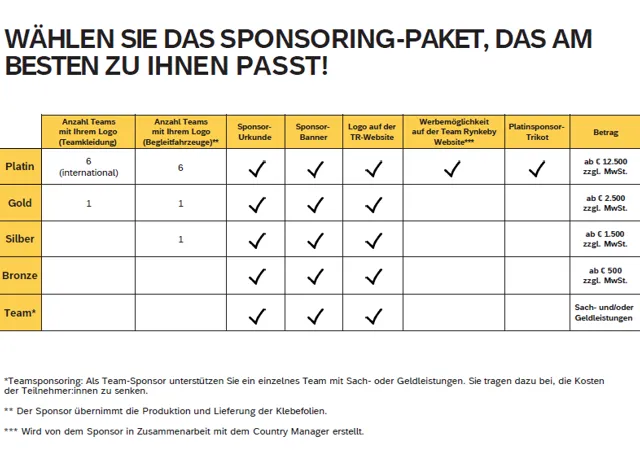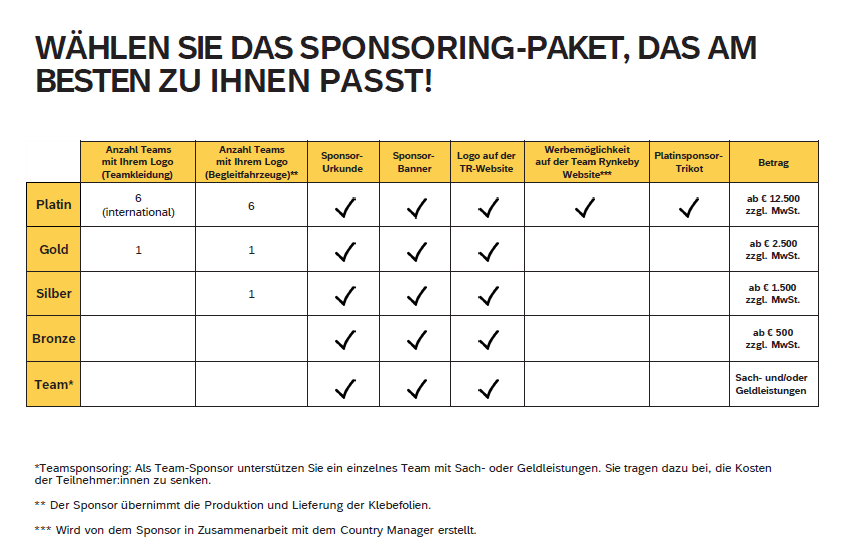 Team Rynkeby bietet eine Reihe verschiedener Arten von Sponsoring an, mit denen Sie Ihrem sozialen Engagement Ausdruck verleihen können. Wenn Sie als Unternehmen an anderen Formen der Zusammenarbeit interessiert sind, die nicht in unserer Sponsoring-Mappe beschrieben sind, können Sie uns gerne kontaktieren.